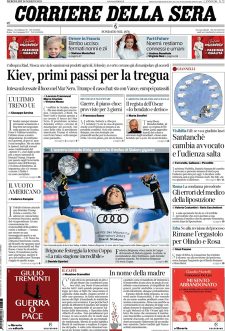 Oggi in apertura sui quotidiani ci sono diverse notizie: la trattativa per una tregua fra Russia e Ucraina, le critiche all’Europa del presidente degli Stati Uniti Donald Trump, la discussione sui dazi e la vicenda processuale della ministra del Turismo Daniela Santanchè. “Kiev, primi passi per la tregua”, titola Il Corriere della Sera. “Europei parassiti”, è l’apertura di Repubblica. “Visibilia, altra furbata: salvata coi fondi Covid”, è invece la prima pagina del Fatto Quotidiano.