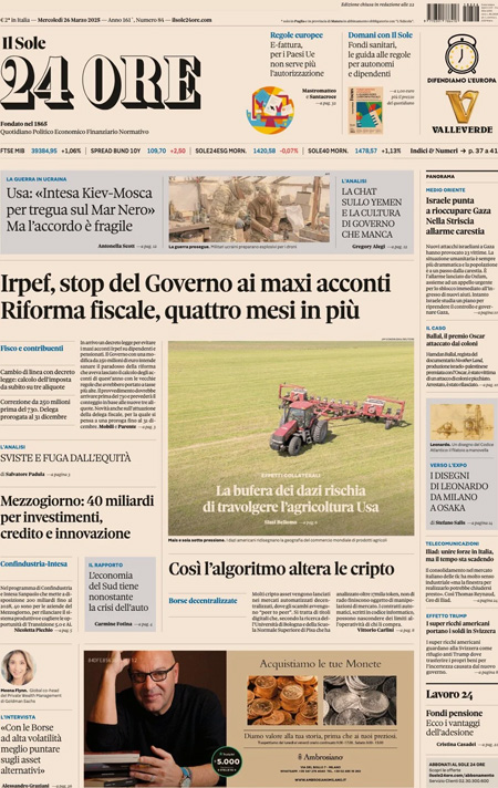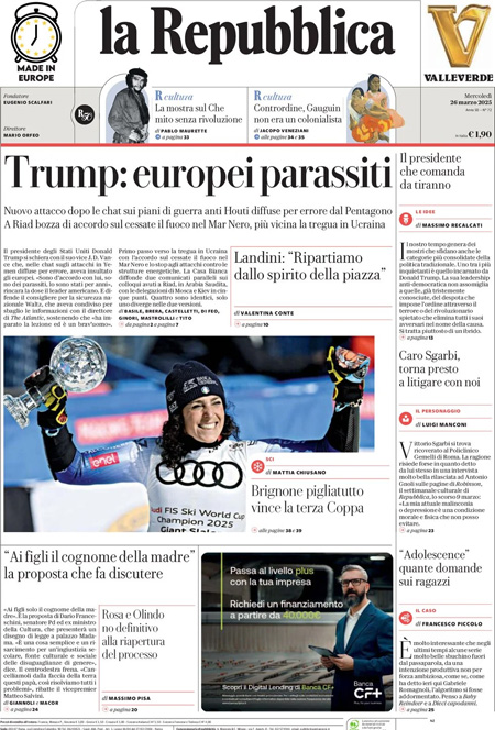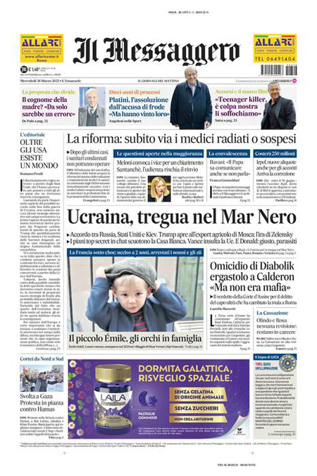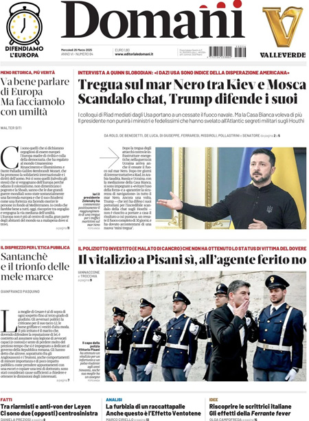 “Tregua sul Mar Nero tra Kiev e Mosca. Scandalo chat, Trump difende i suoi” (Domani).
