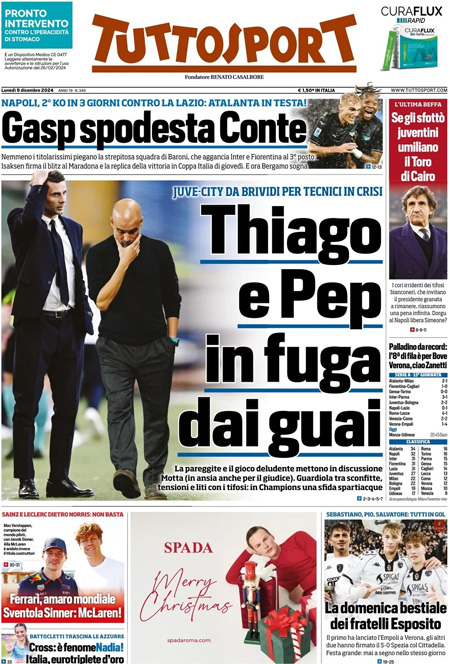 Sulle prime pagine sportive di oggi, lunedì 9 dicembre, grande risalto alla quindicesima giornata di Serie A che ha visto l’Atalanta prendersi la vetta e la Lazio battere il Napoli al Maradona. Spazio anche all’ultimo Gp del Mondiale di F1 dove la McLaren si è presa il titolo costruttori.